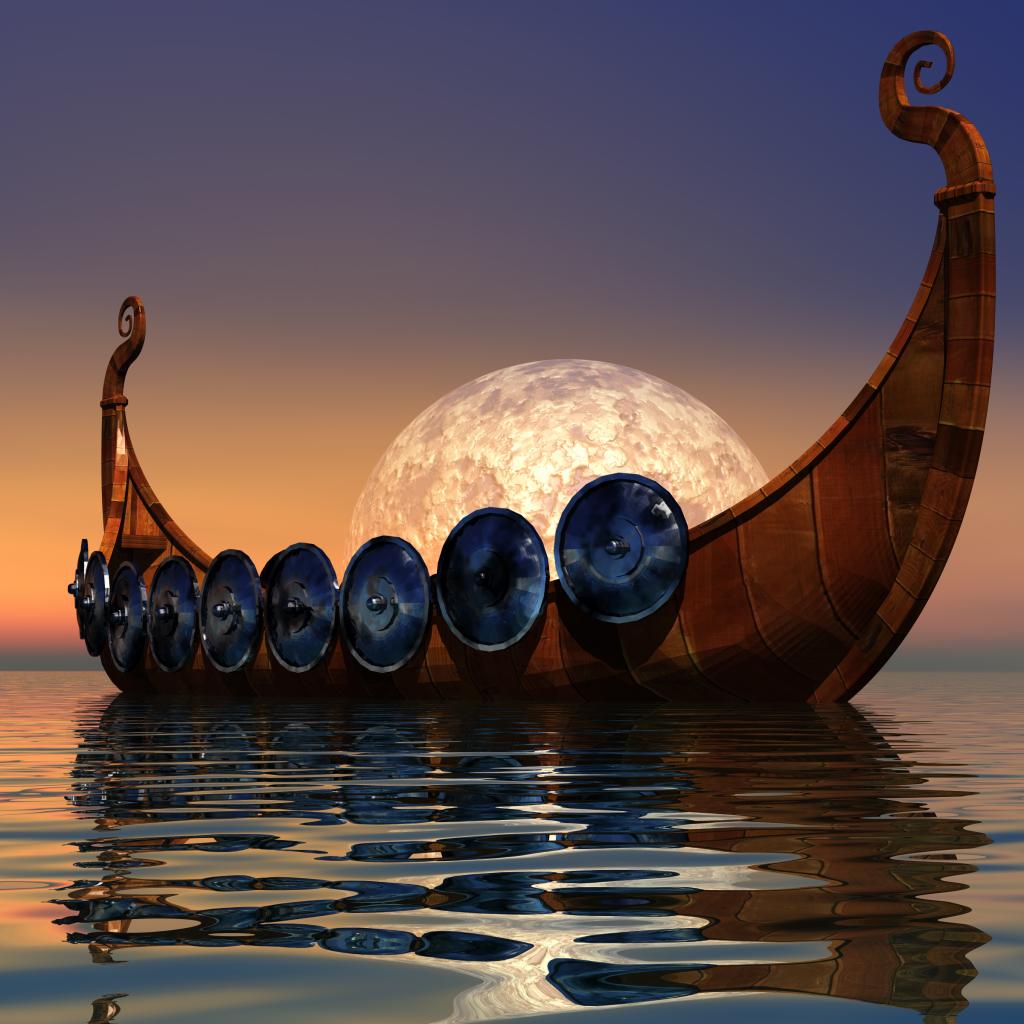 Wallpaper Viking boat on the background of the moon in the water 3d graphics