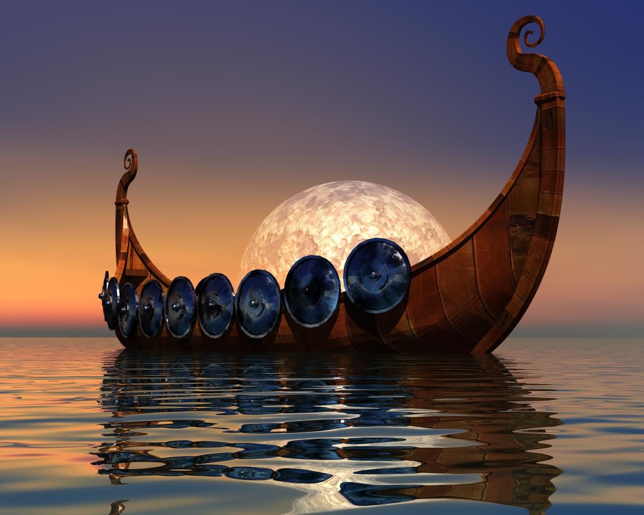 Wallpaper Viking boat on the background of the moon in the water 3d graphics