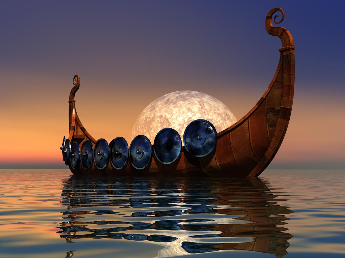 Wallpaper Viking boat on the background of the moon in the water 3d graphics