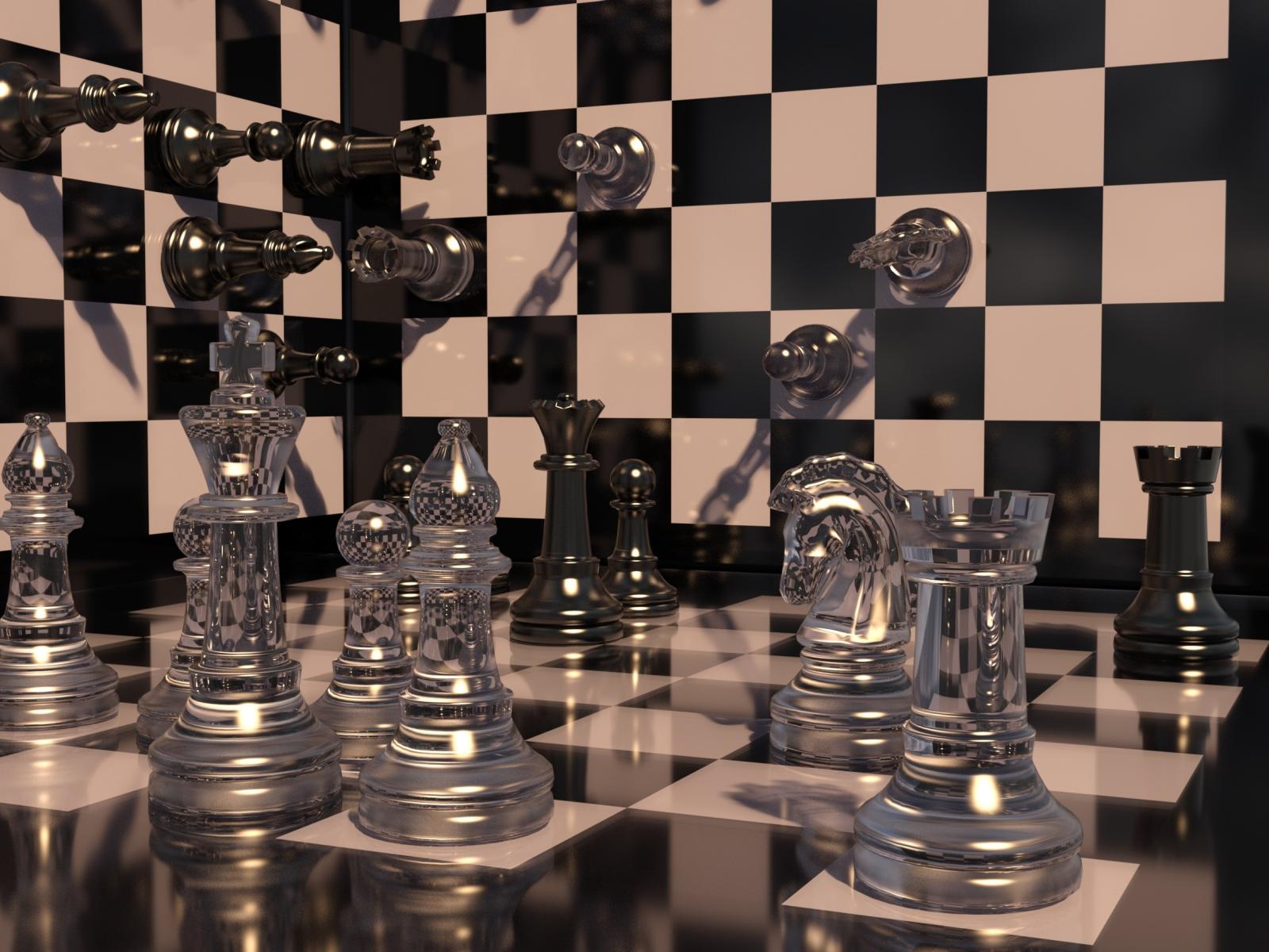 Wallpaper Chessboard with transparent chess pieces 3d graphics
