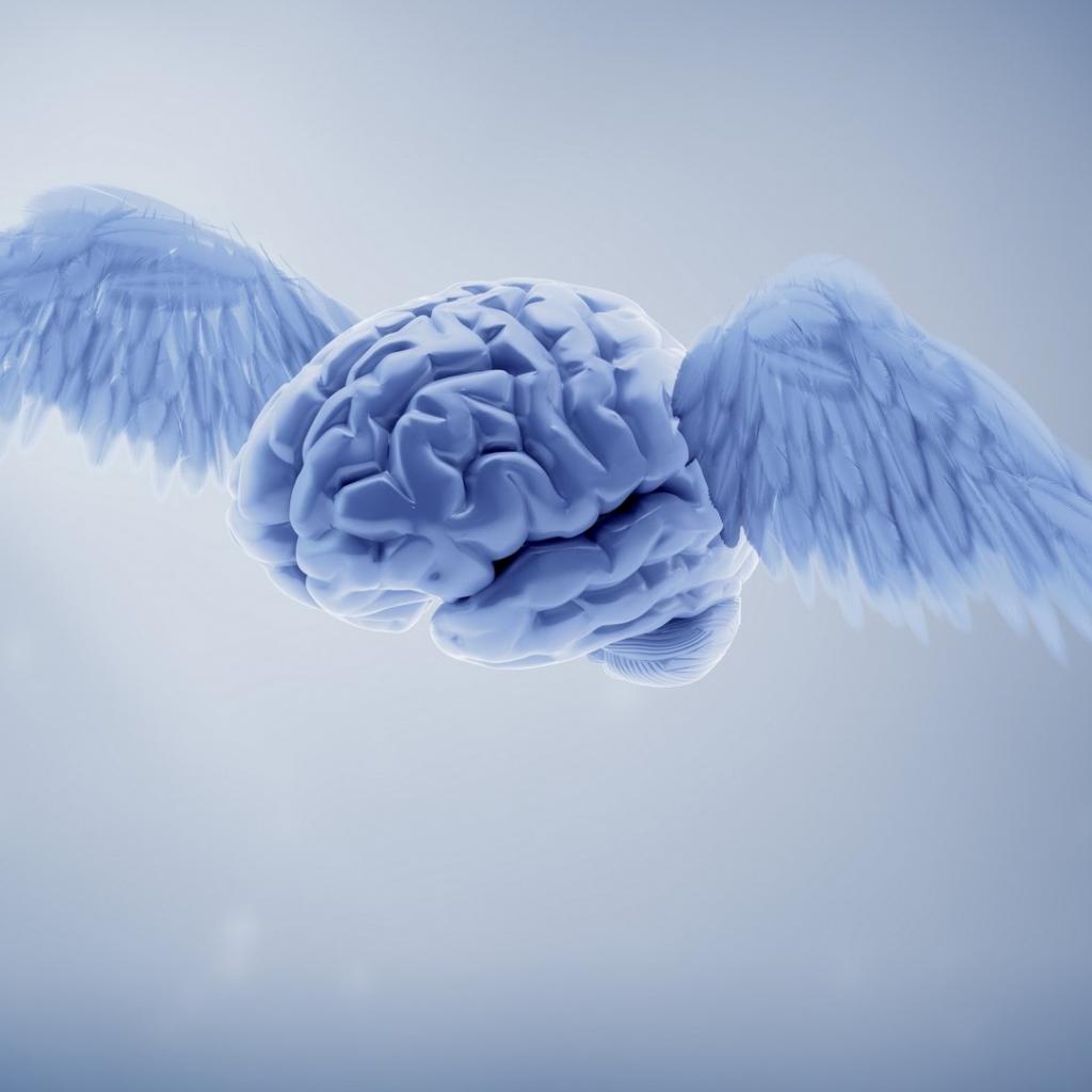 Wallpaper Blue brain with wings on a gray background 3d graphics