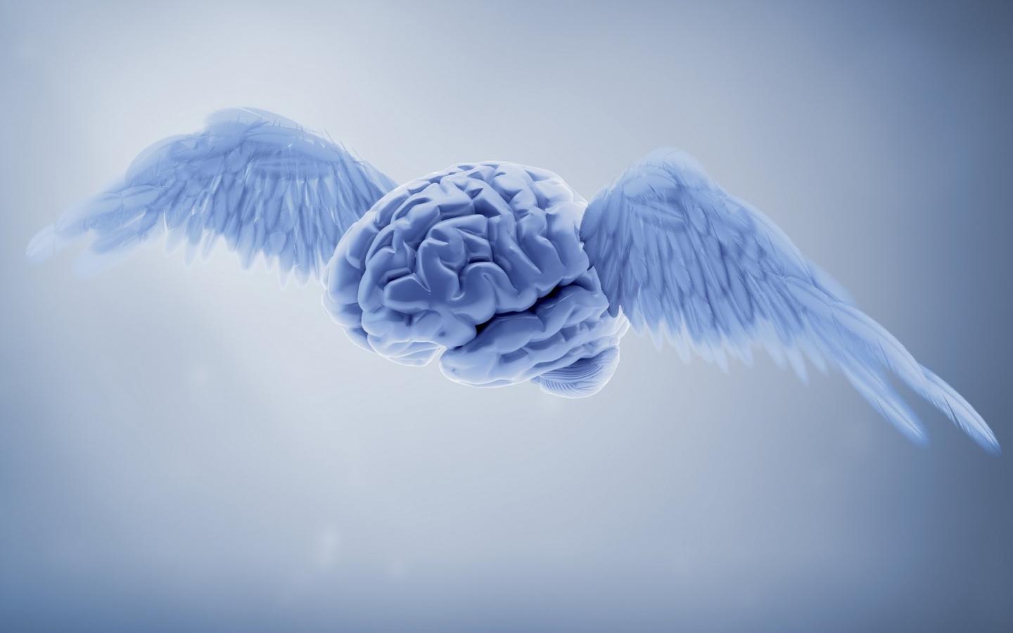 Wallpaper Blue brain with wings on a gray background 3d graphics