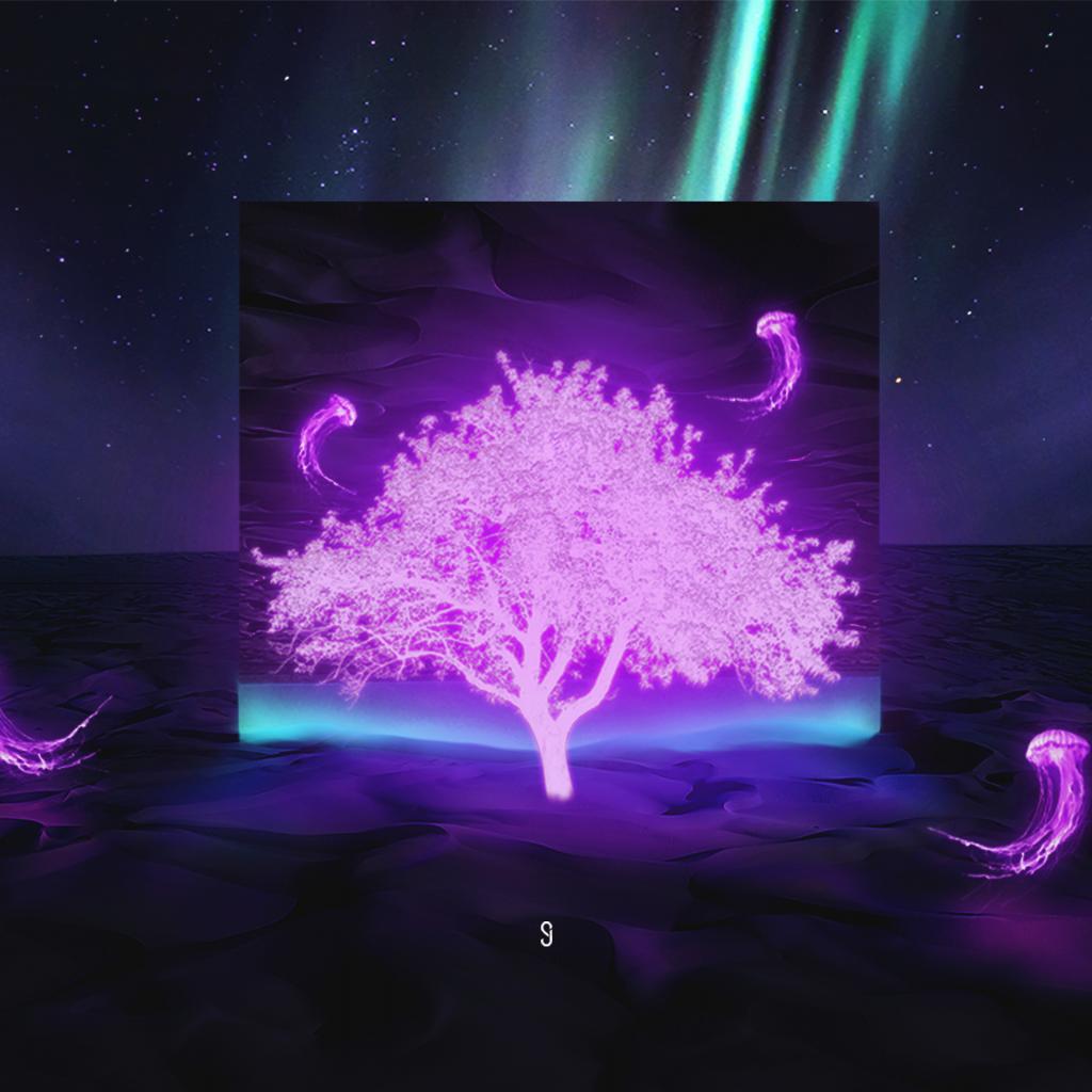 Wallpaper Neon tree in the desert against the sky with northern lights