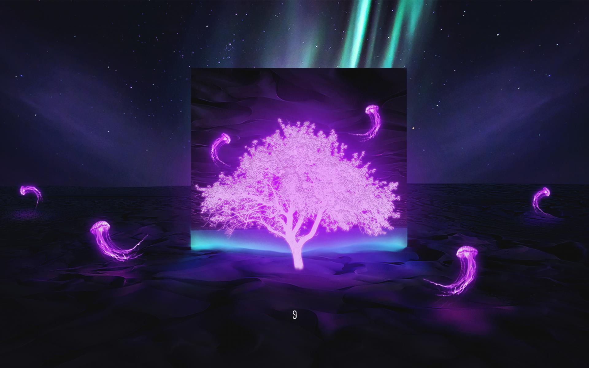 Wallpaper Neon tree in the desert against the sky with northern lights