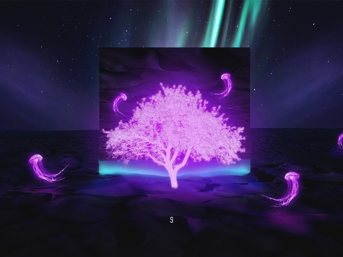 Wallpaper Neon tree in the desert against the sky with northern lights