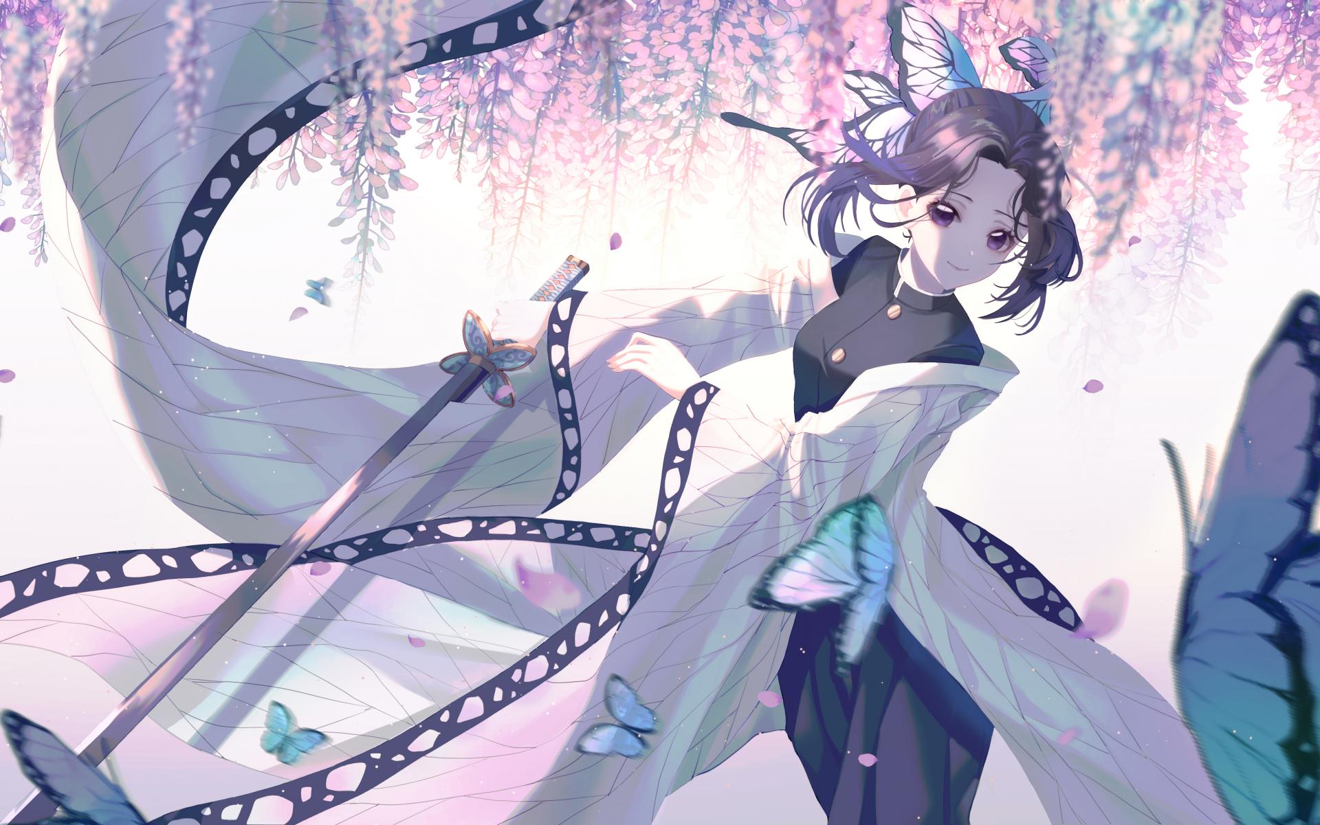 Wallpaper Beautiful Asian girl with a sword and blue butterflies