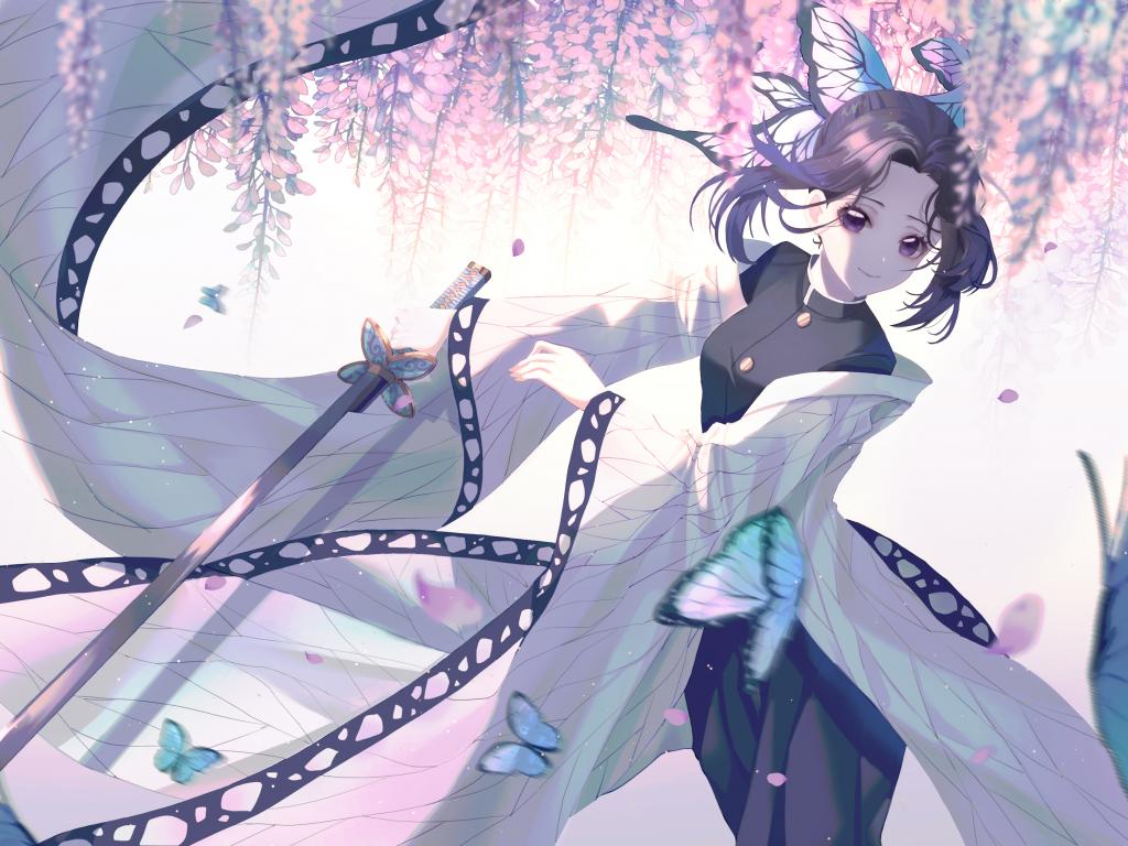 Wallpaper Beautiful Asian girl with a sword and blue butterflies