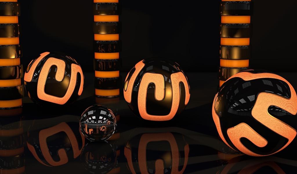 Wallpaper Orange-black 3d balls are reflected in the surface