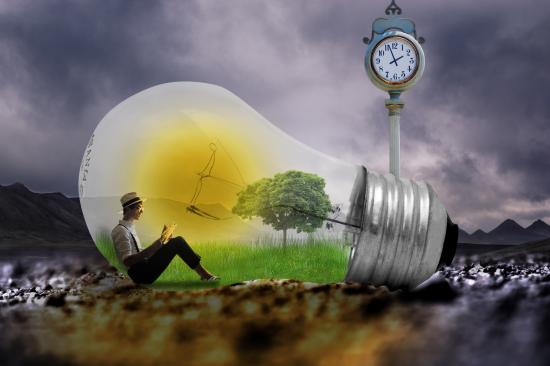 Wallpaper A man sits in a big fantastic light bulb by the clock
