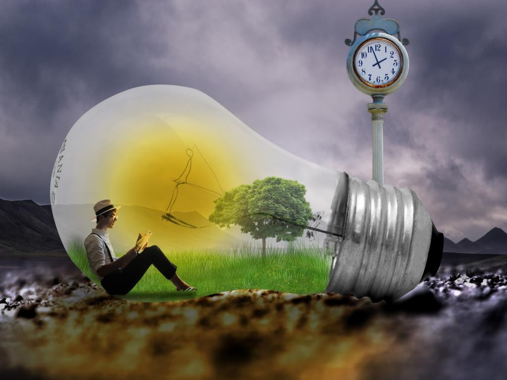 Wallpaper A man sits in a big fantastic light bulb by the clock
