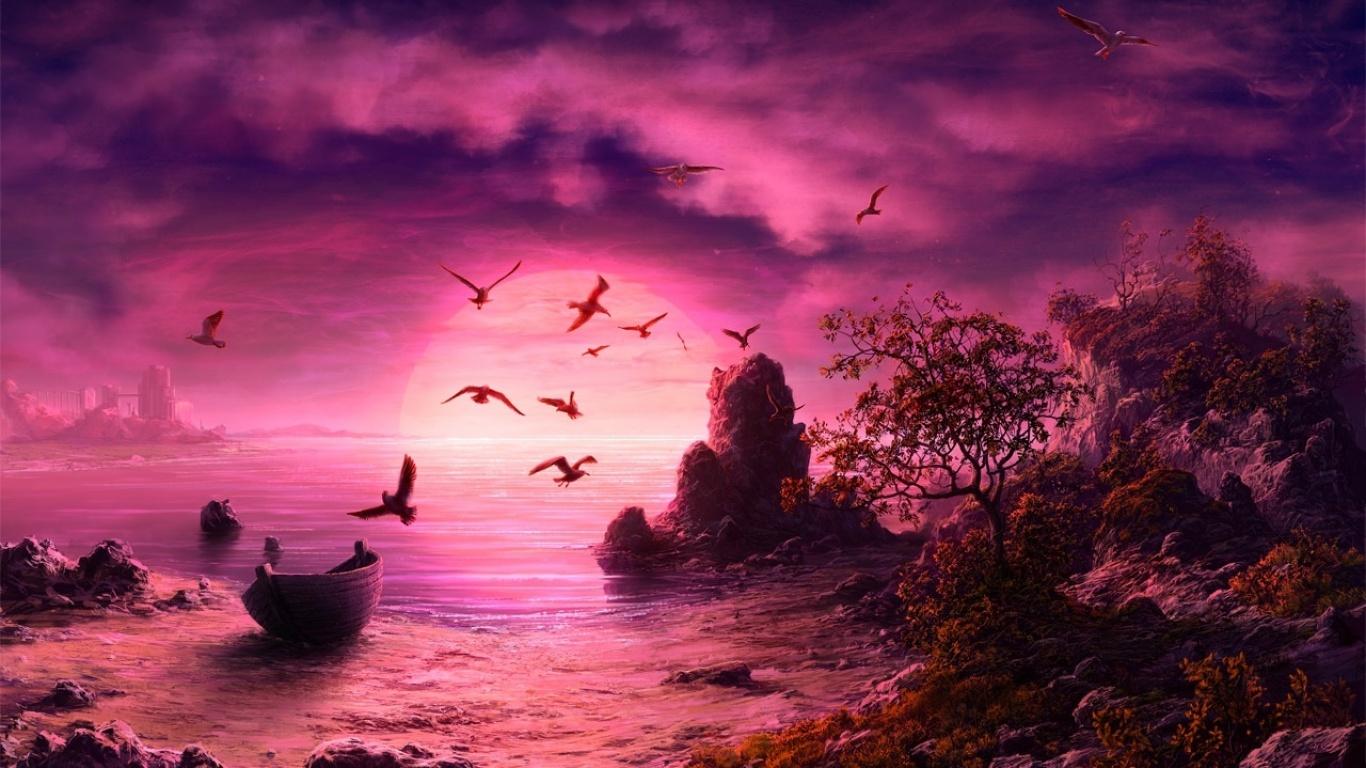 Wallpaper Bare rock near the shore on the background of purple sunset