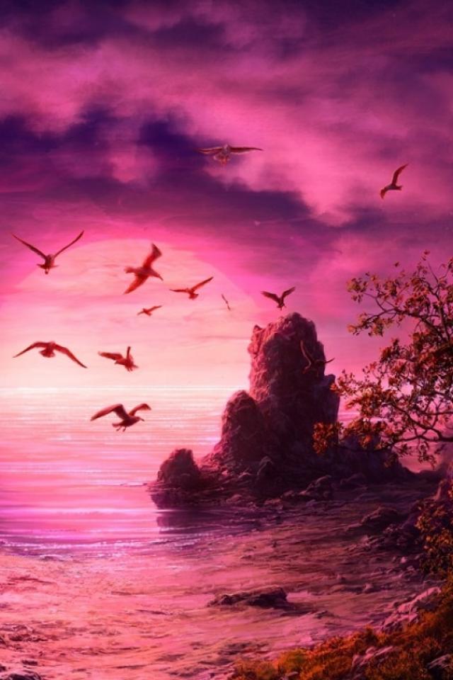 Wallpaper Bare rock near the shore on the background of purple sunset