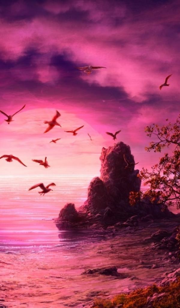 Wallpaper Bare rock near the shore on the background of purple sunset
