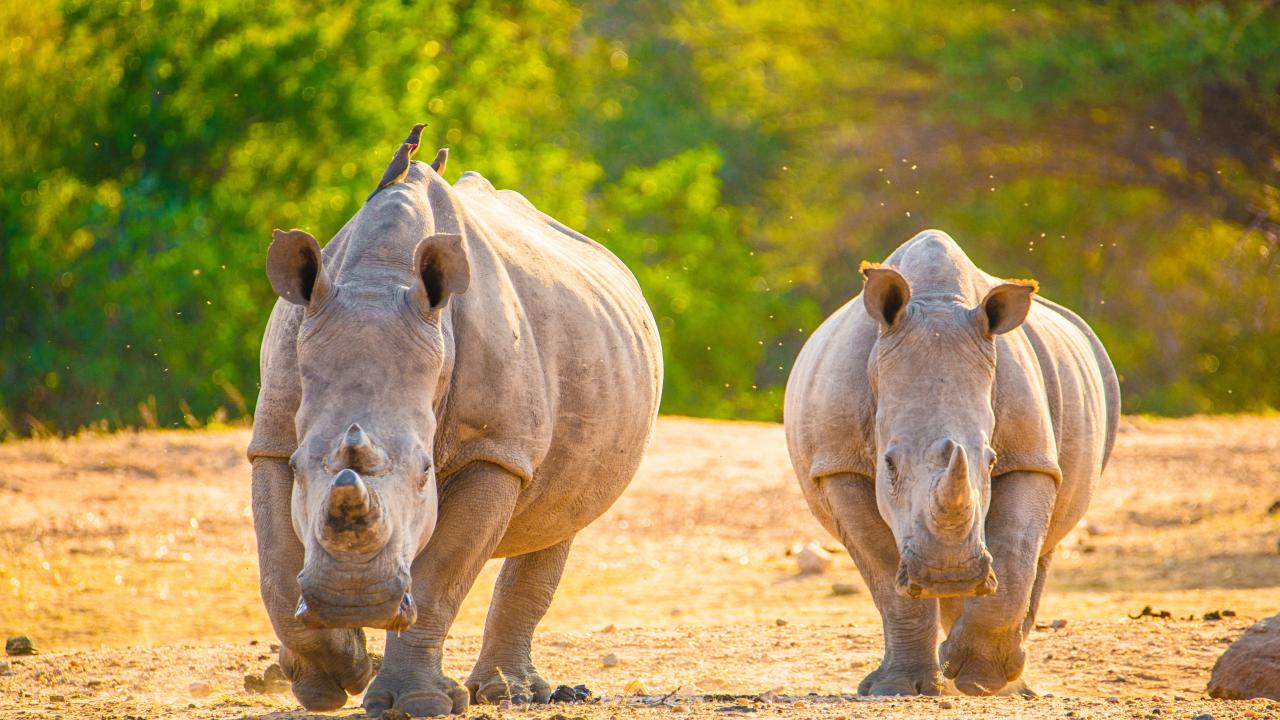 » Wallpaper Two rhinos run on hot sand