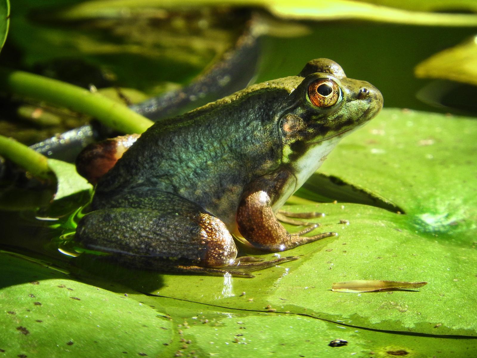 Wallpaper A big green toad sits on a green leaf.