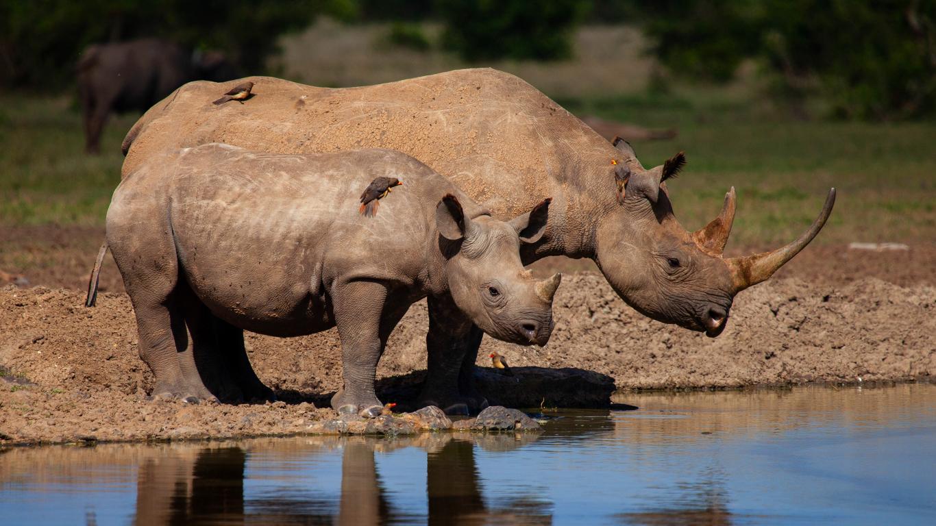 Wallpaper Big rhino with cub near the water