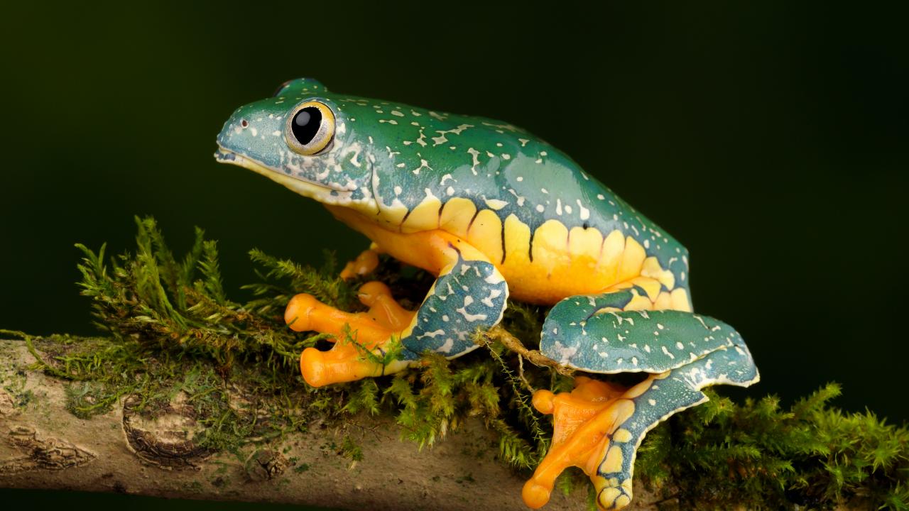 Wallpaper A green frog with a yellow belly sits on a branch