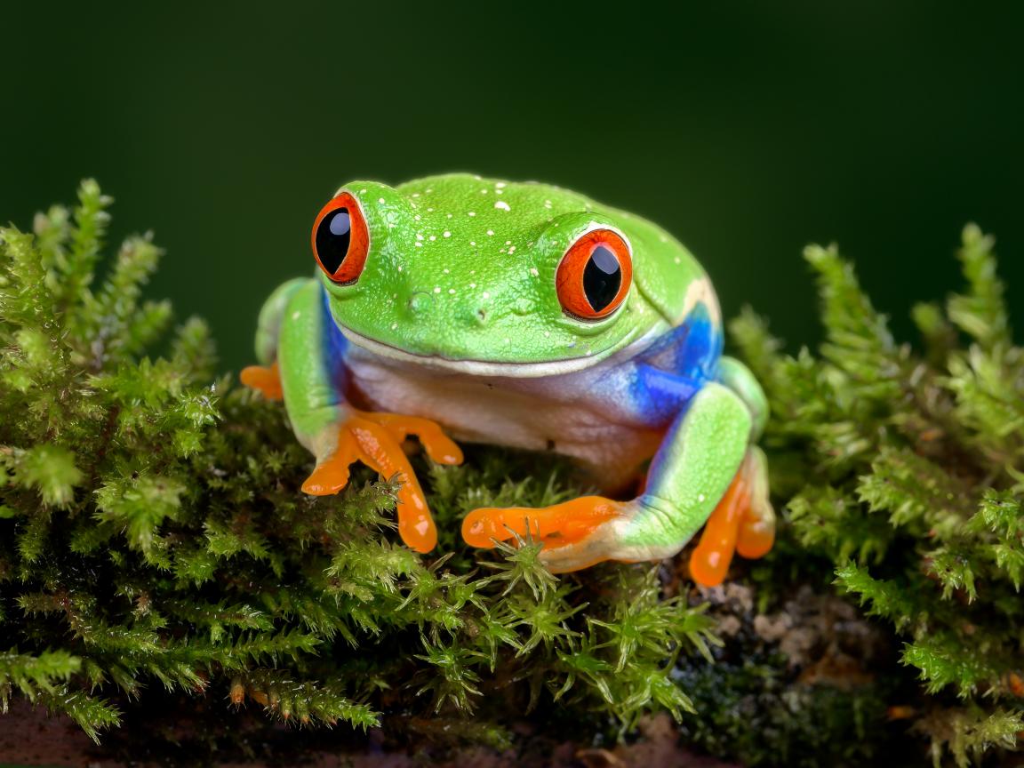 Wallpaper A large green frog with red eyes sits on a moss-covered branch