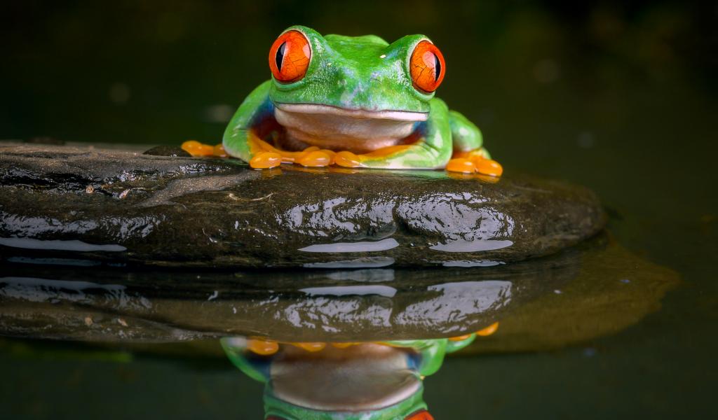 Wallpaper A green frog with red eyes sits on a stone in the water