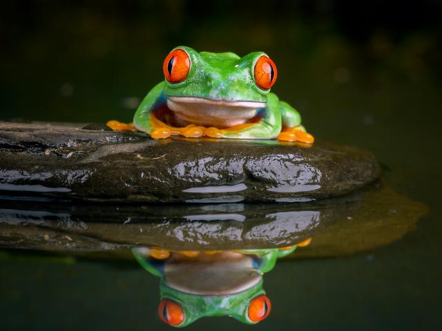 Wallpaper A green frog with red eyes sits on a stone in the water