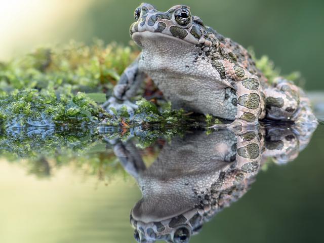 Wallpaper Big frog sits on seaweed in a pond