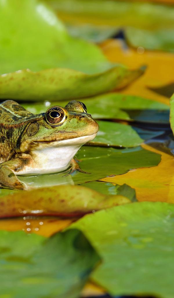 Wallpaper A green frog sits on a green leaf in a pond