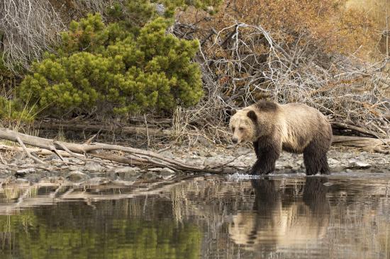 Wallpaper A big brown bear walks along the water