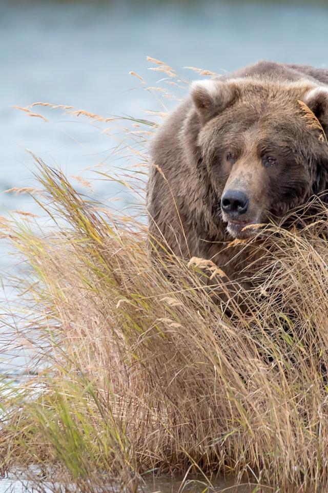 Wallpaper A large brown bear walks in thickets along the water