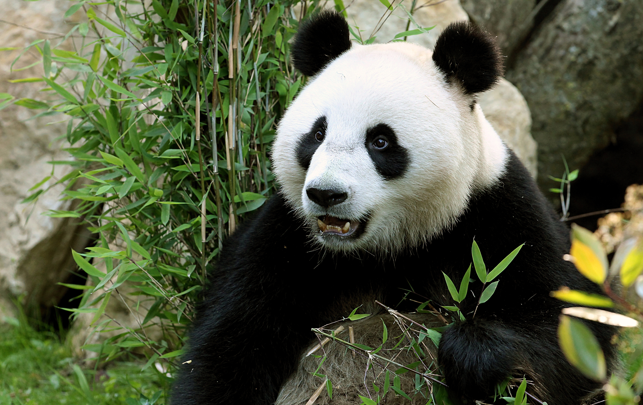 Wallpaper A wet panda bear eats green leaves