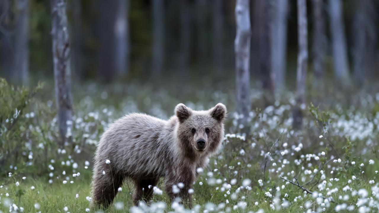 Wallpaper A small brown bear cub standing in a glade with white flowers
