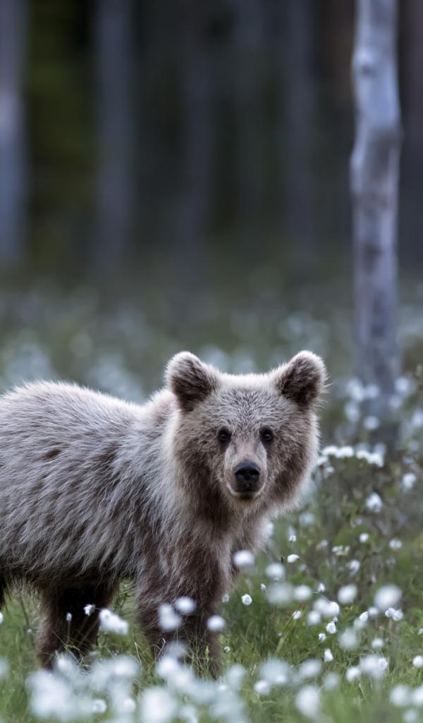 Wallpaper A small brown bear cub standing in a glade with white flowers