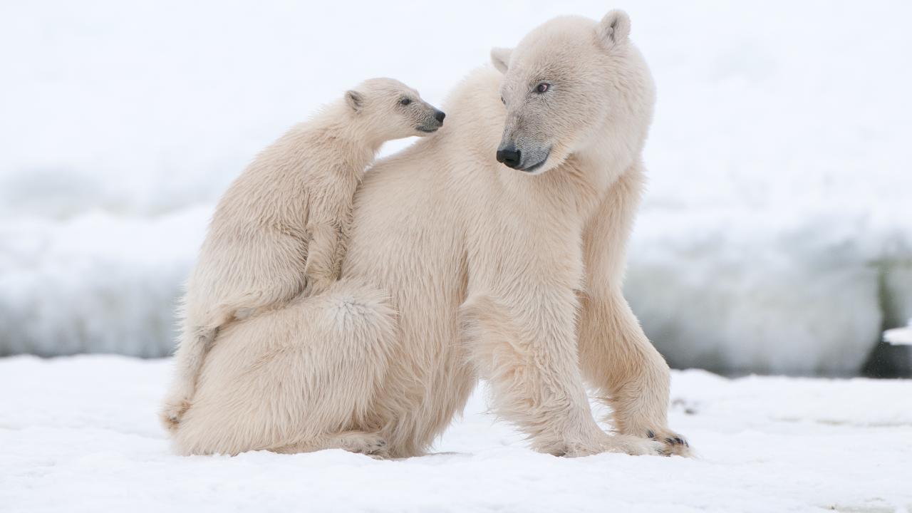 Wallpaper Large white bear with a small bear in the snow