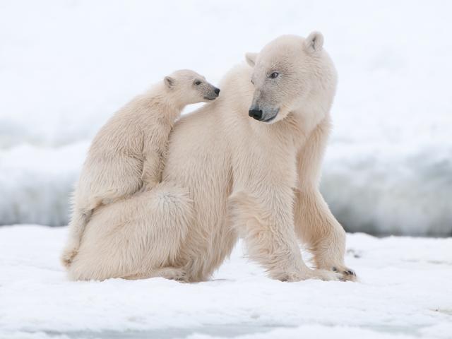 Wallpaper Large white bear with a small bear in the snow