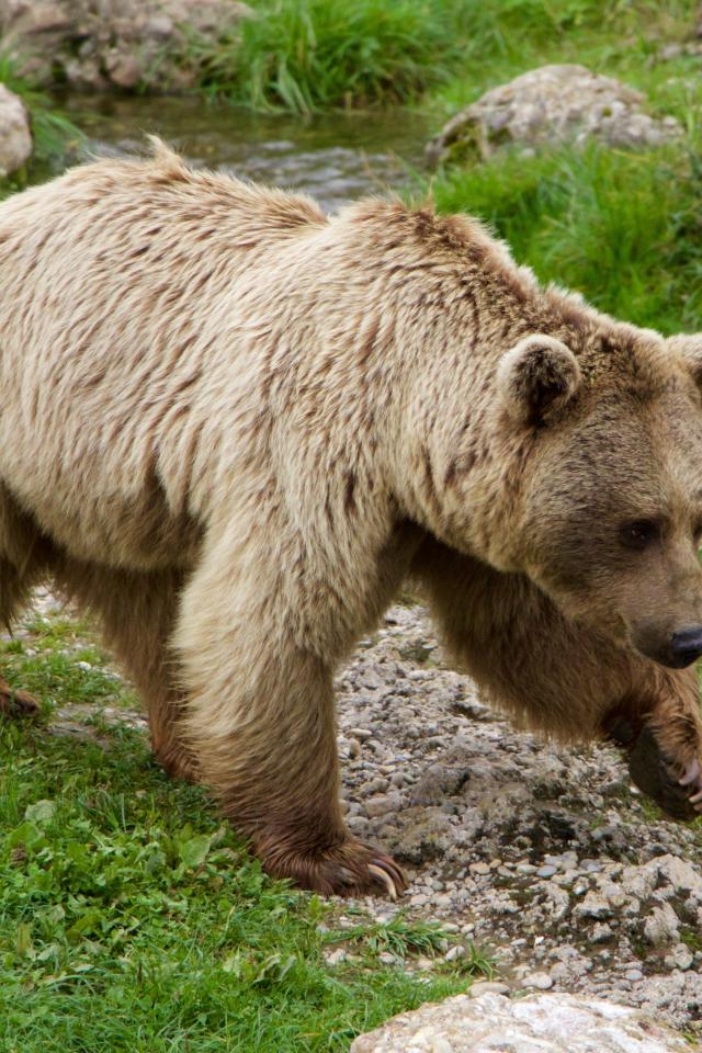 Wallpaper A large brown bear walks along the green grass by the stream