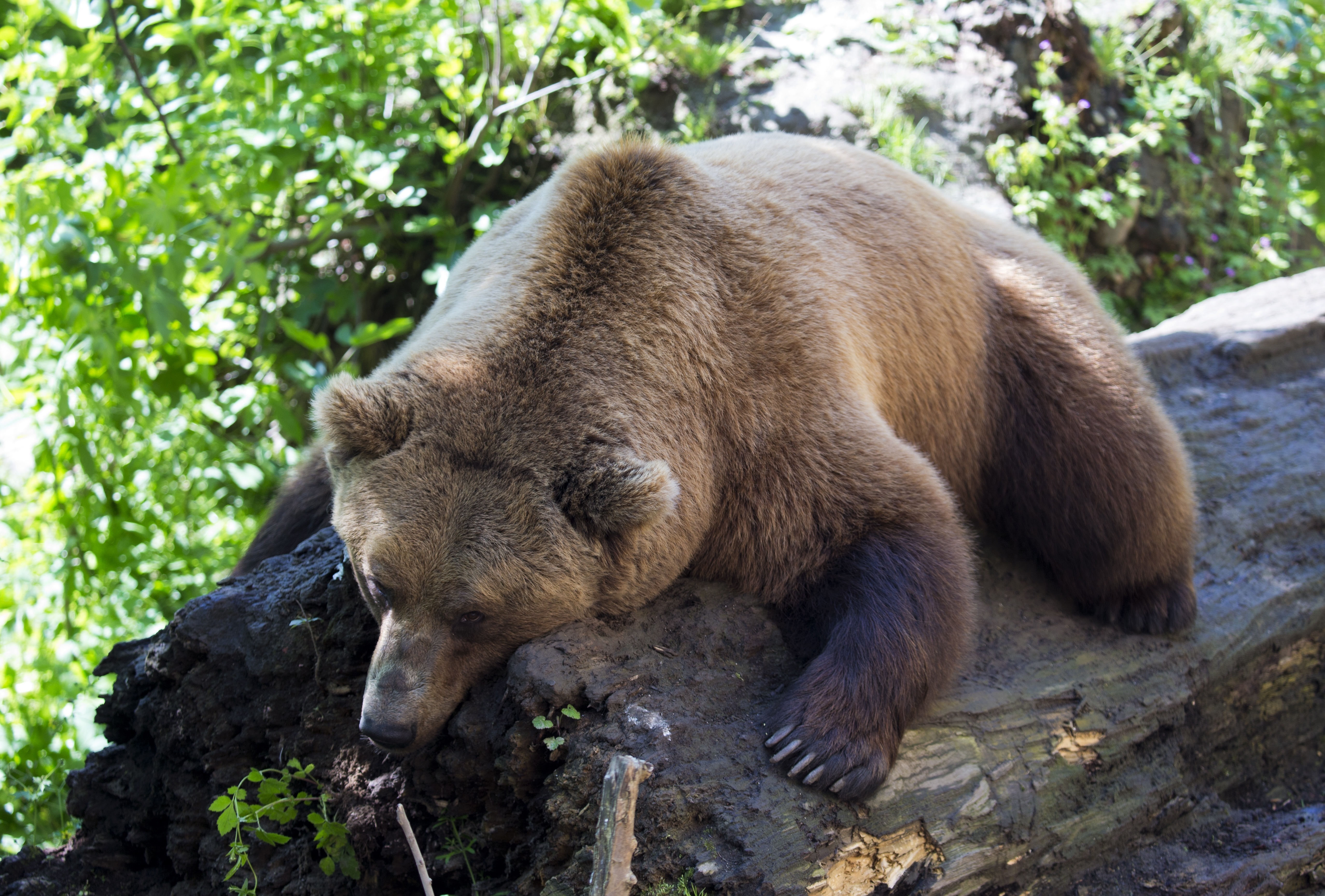 Wallpaper A large brown bear lies on a dry tree