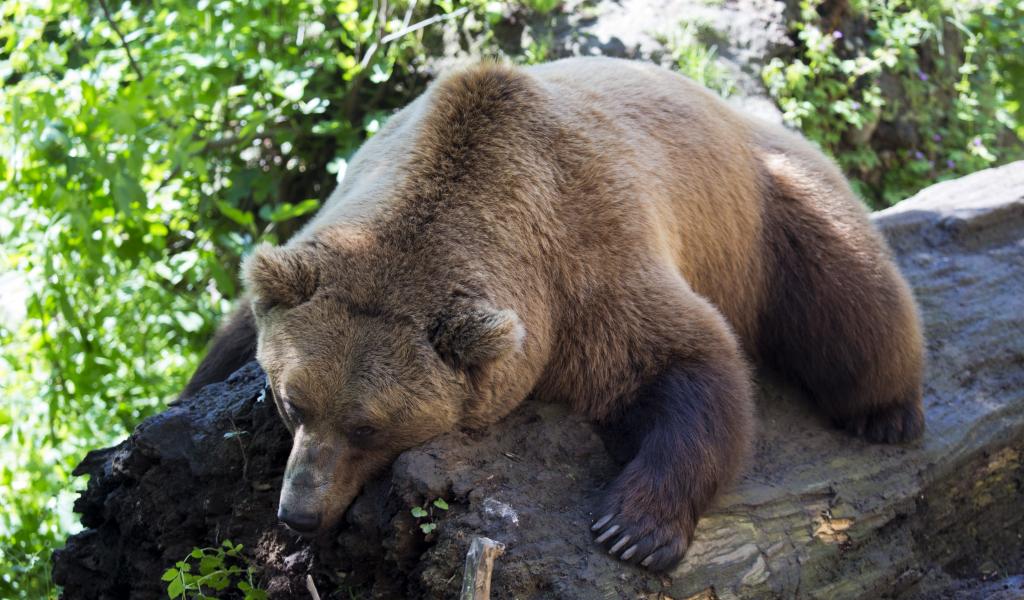 Wallpaper A large brown bear lies on a dry tree