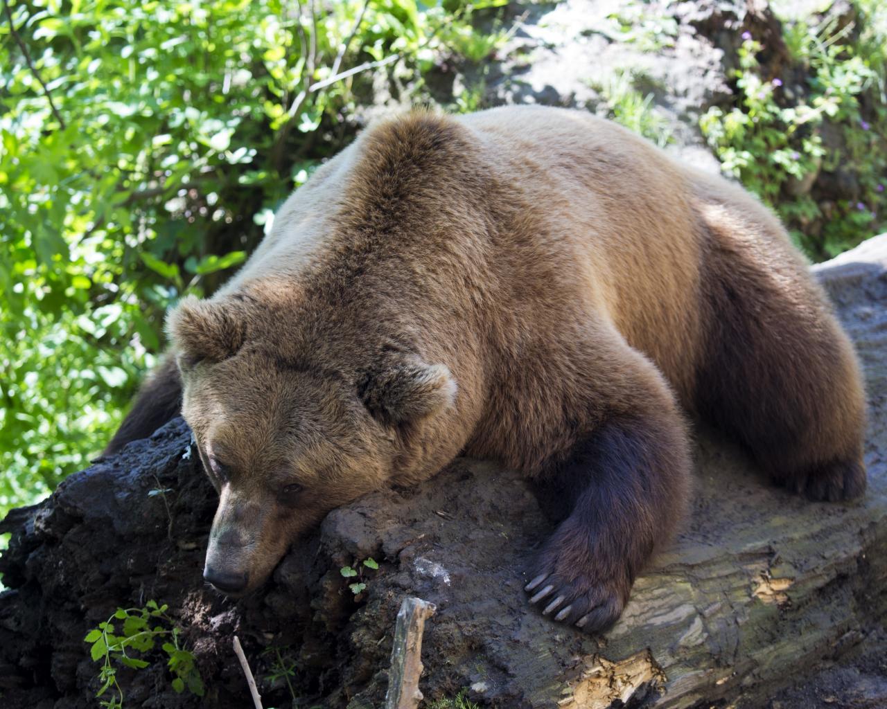 Wallpaper A large brown bear lies on a dry tree