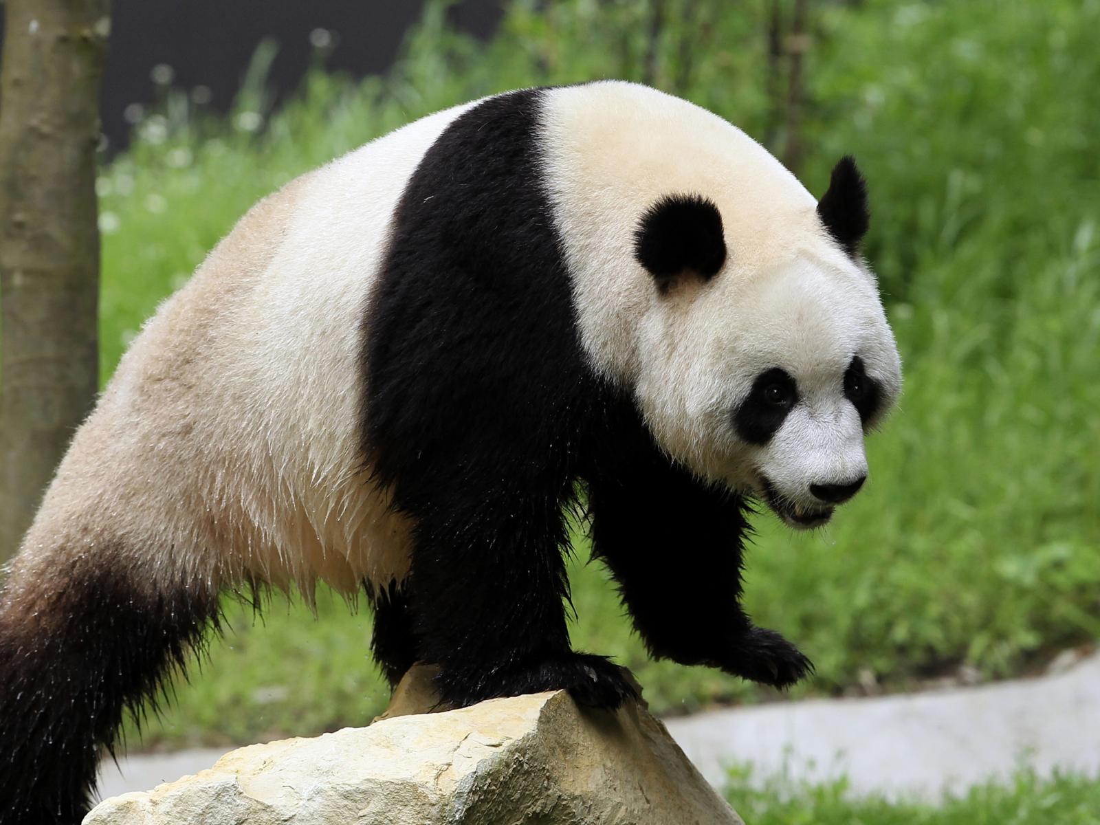 Wallpaper Wet big panda bear stands on a rock