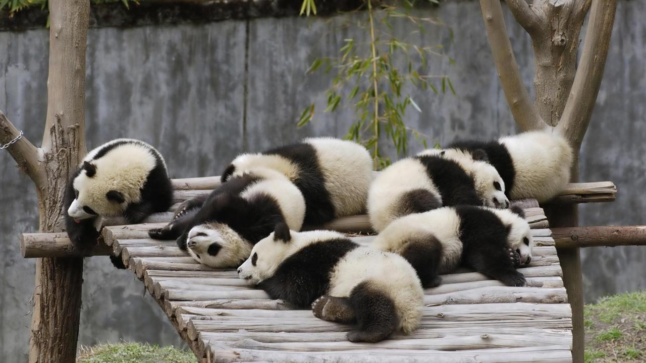 Wallpaper Little cute pandas sleeping on a wooden bridge