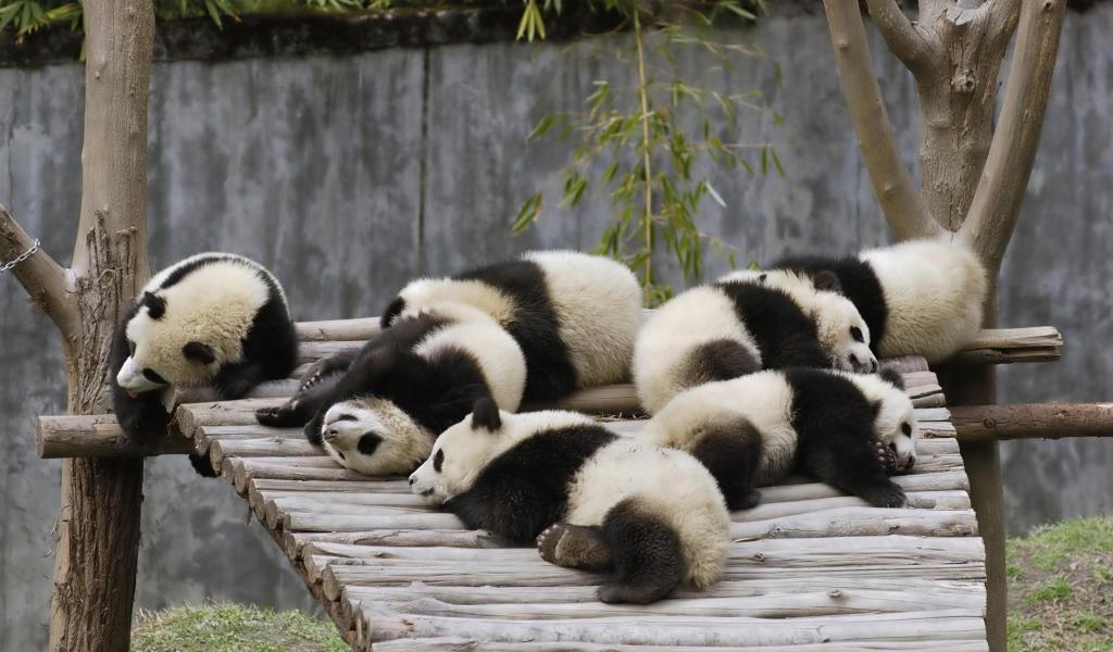 Wallpaper Little cute pandas sleeping on a wooden bridge