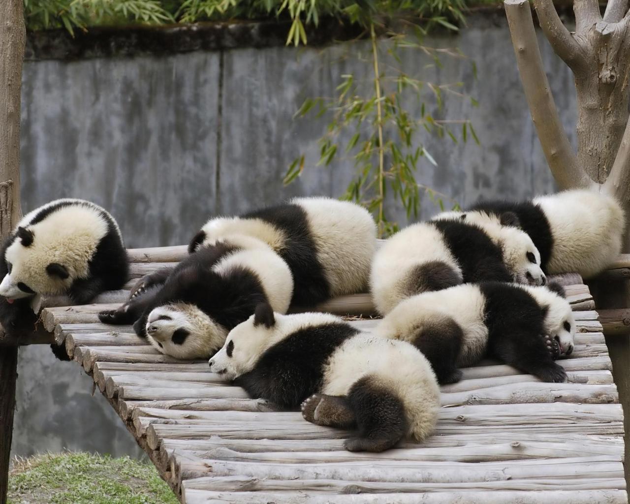 Wallpaper Little cute pandas sleeping on a wooden bridge