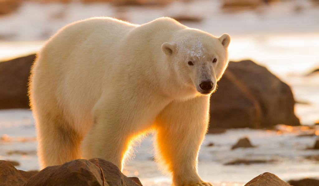 Wallpaper A large polar bear walks on stones in the light of the sun