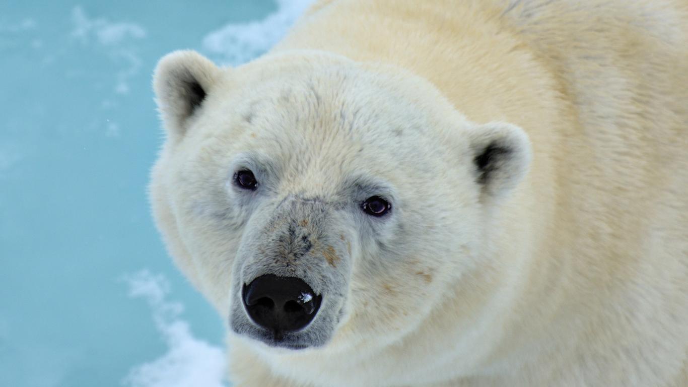 Wallpaper A large polar bear walks on stones in the light of the sun