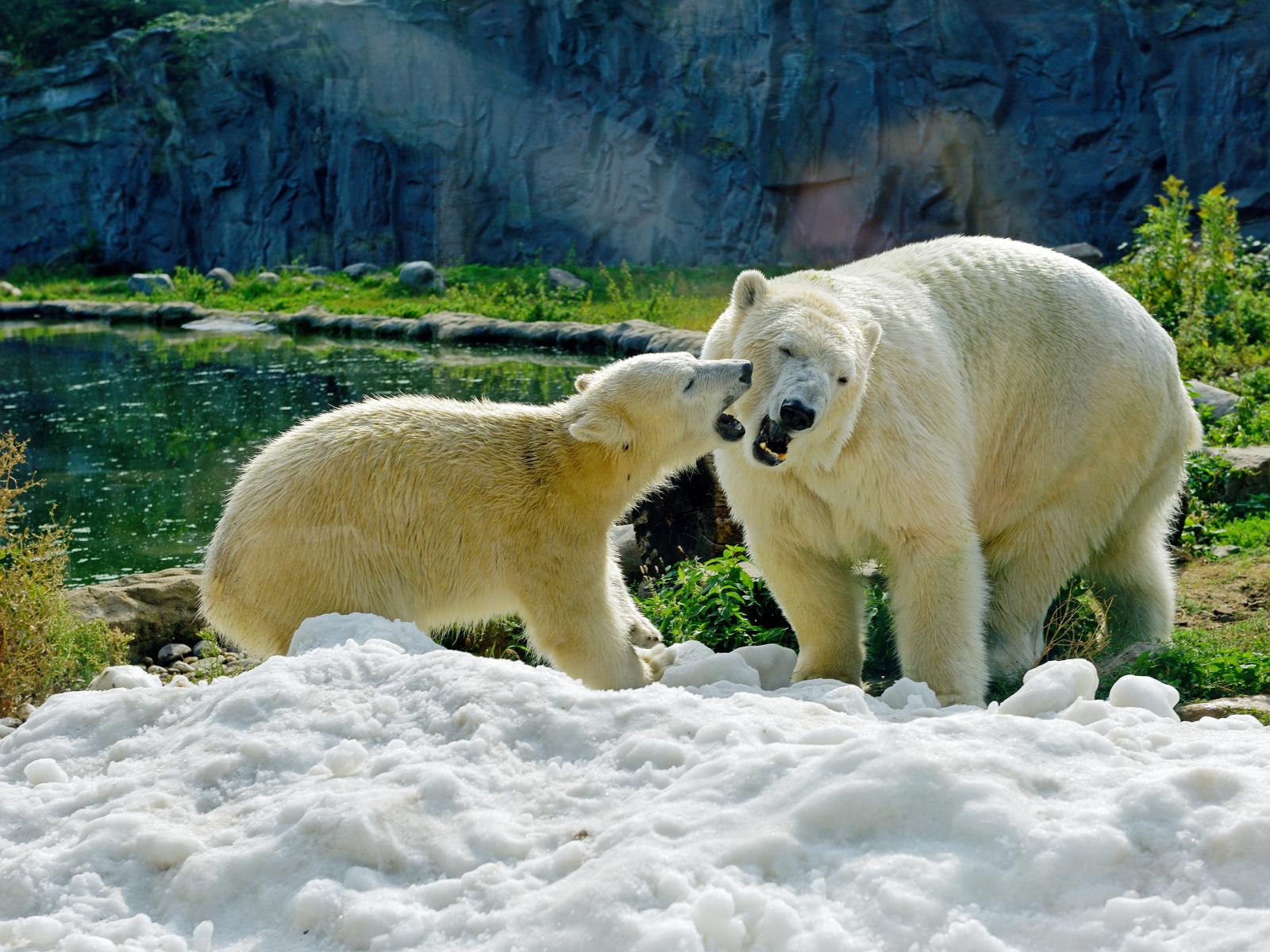 Wallpaper Big white bear with a teddy bear on the snow at the zoo