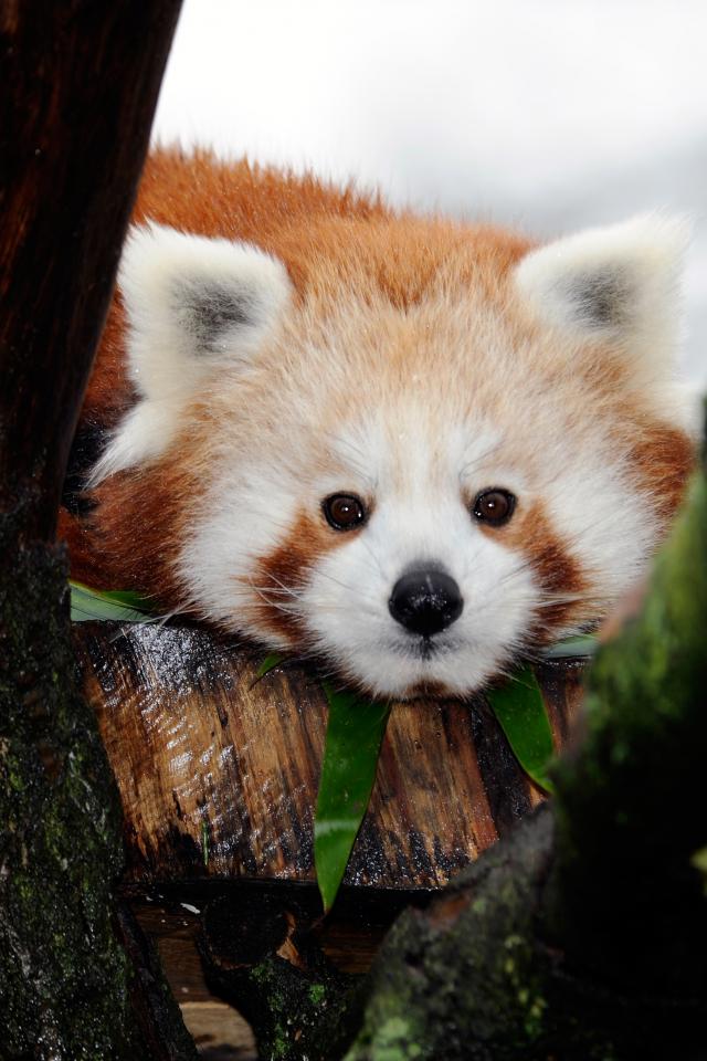 Wallpaper Red panda lies on a tree trunk