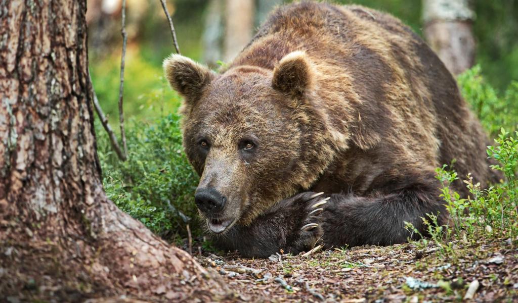 Wallpaper Big brown bear lies on the grass in the forest