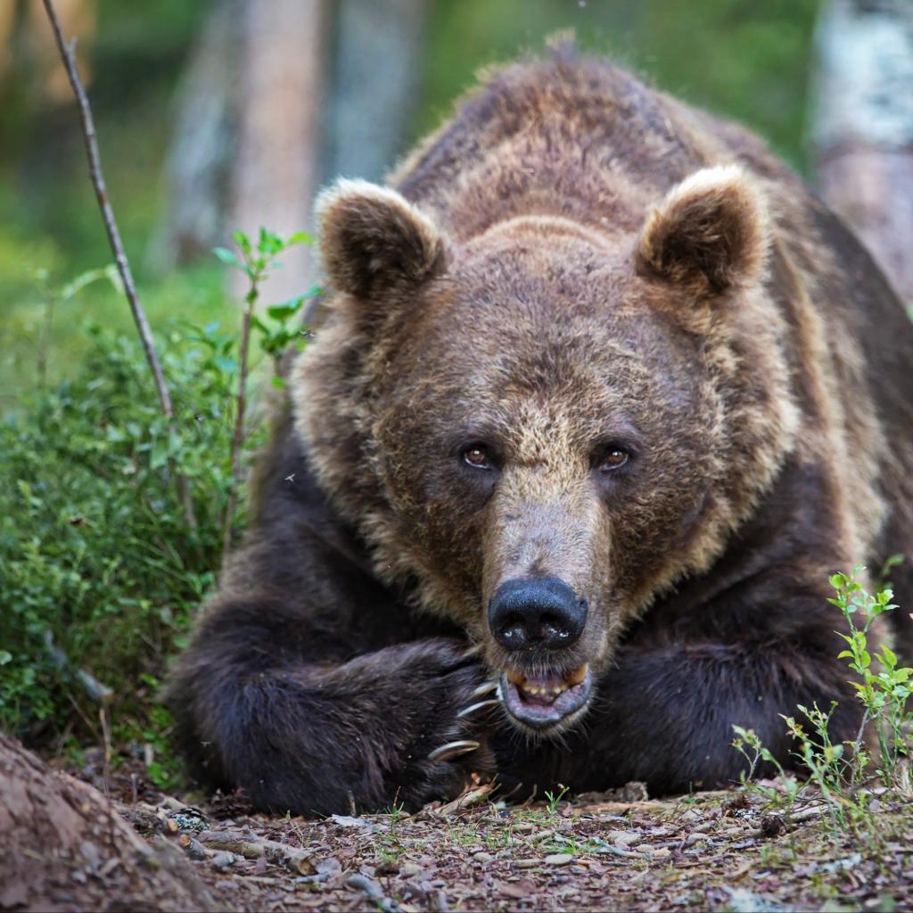Wallpaper Big brown bear lies in the forest near the tree