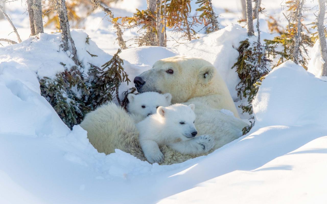 Wallpaper Big polar bear with cubs in the snow