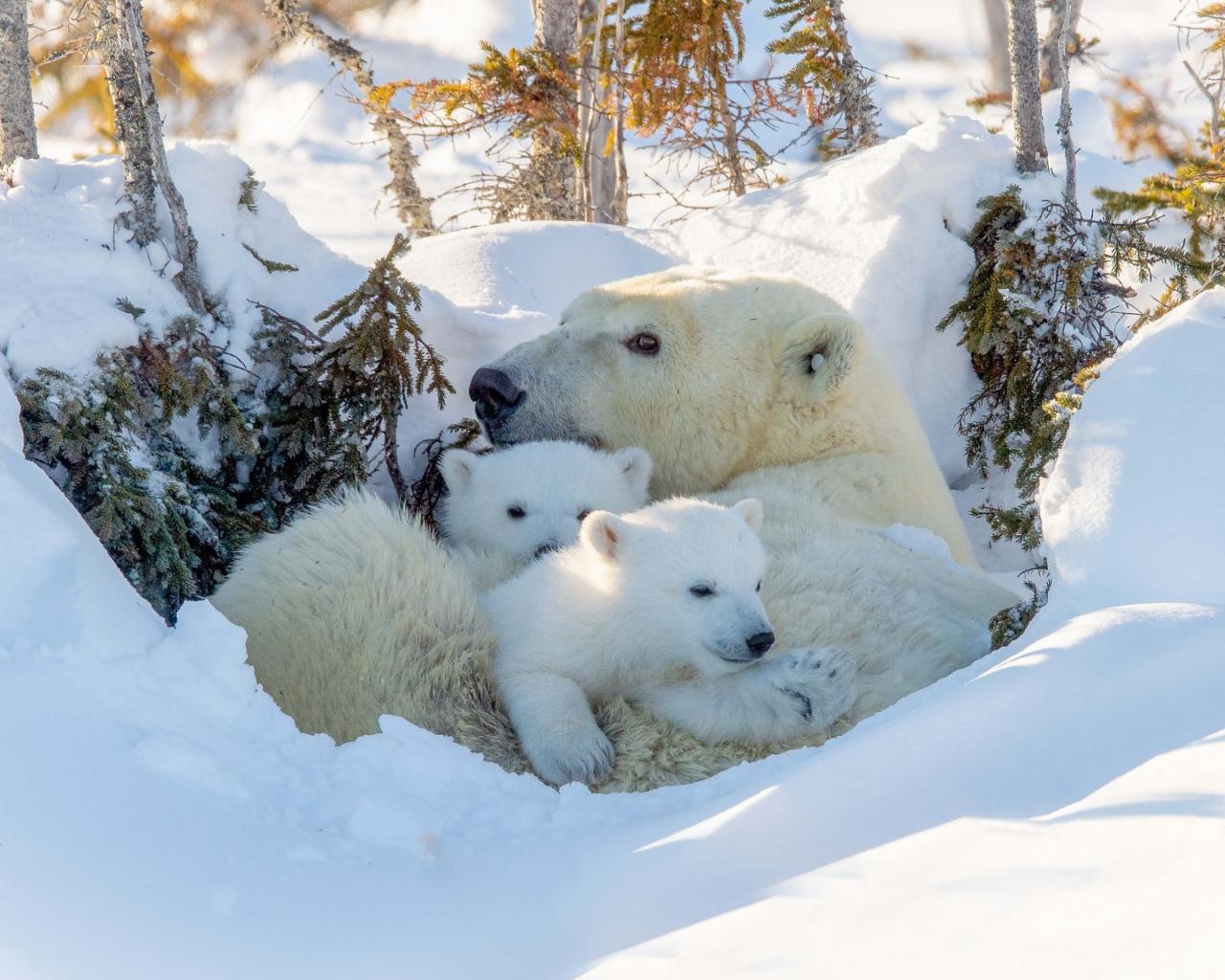 Wallpaper Big polar bear with cubs in the snow