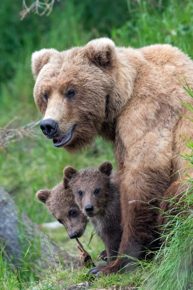 Wallpaper Brown bear with little cubs in the grass